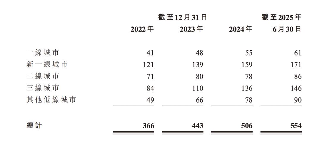 线下门店是其高端定位的不可或缺支撑力,根据招股书,其门店从2022年的366家增长至2025年6月末的554家,其中超95%布局于购物商场。截至2025年6月30日,门店覆盖一线城市61家、新一线城市171家、二线城市86家,三线146家,其他低线城市90家。