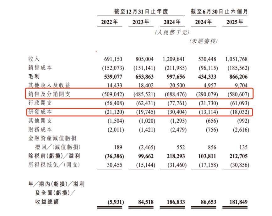 招股书显示,2022 年至 2025 年上半年,林清轩的销售及分销开支累计达 22.63 亿元,2025 年上半年该项开支为5.81亿元,占当期营收的55.2%。