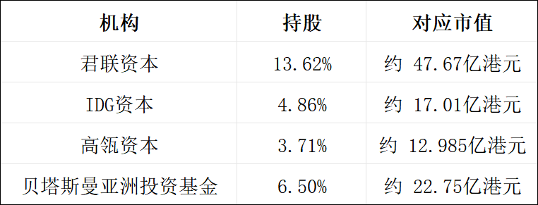 以最新市值计算,君联资本持有的股份价值已超过47亿港元,IDG资本持股价值超17亿港元,高瓴资本持股价值近13亿港元。
