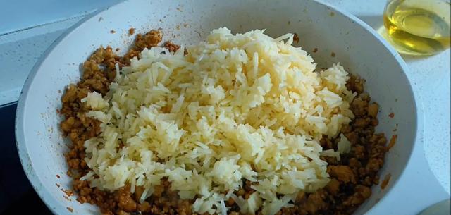 准备一个大土豆,清洗干净,削去外皮,再用擦板擦成细丝,用刀剁短一点,加入炒好的肉馅中,继续翻炒几下,把土豆丝炒软,这样吃起来会更香。炒好盛出放凉备用。