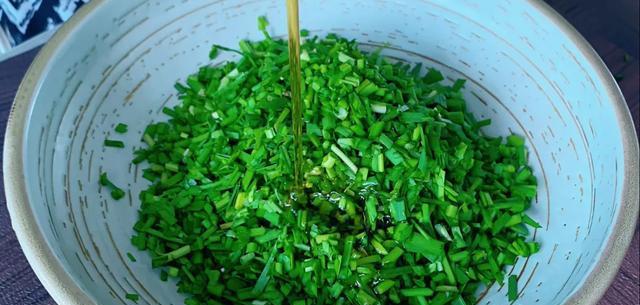准备一把韭菜,提前清洗干净,充分的晾干水分,再切成韭菜碎,加两圈香油搅拌均匀,这样可以形成保护膜隔绝盐分,韭菜不出水。