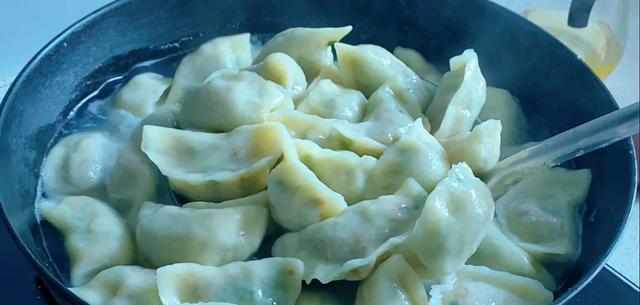 今天的饺子虽然是肉馅的,但肉馅是炒熟的,所以特别容易熟,像煮素饺子一样,滚两开就行。水开下饺子,用铲子轻轻推动几下防止粘锅。煮开后点一碗凉水,再次煮开,饺子都圆鼓鼓的飘起来,就熟透了。