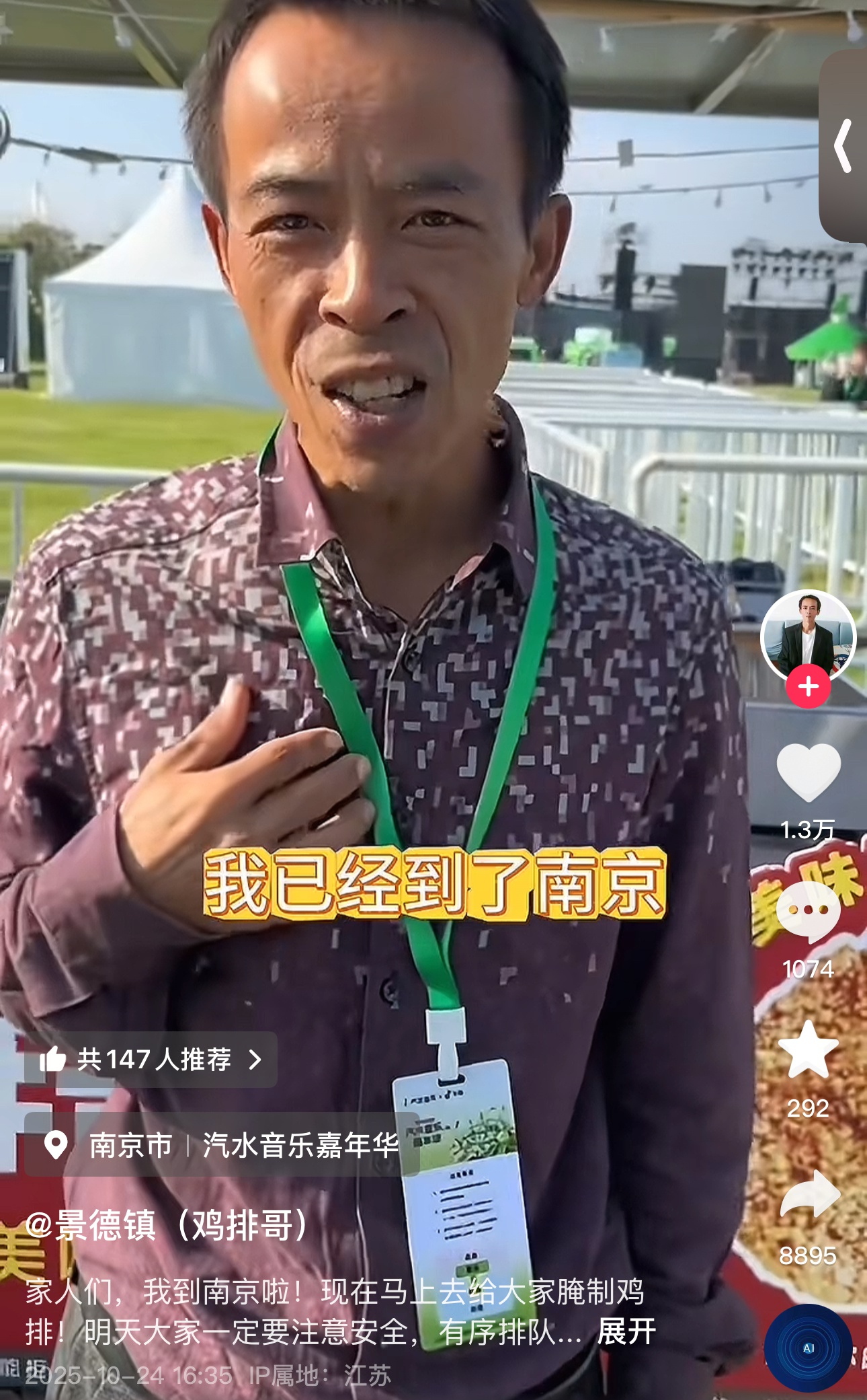 10月24日下午4时许,“鸡排哥”在社交账号中更新视频,“家人们,我到南京啦!现在马上去给大家腌制鸡排!”视频里,他向镜头挥手,介绍自己已到达南京音乐节现场,准备进行腌制鸡排等准备工作。