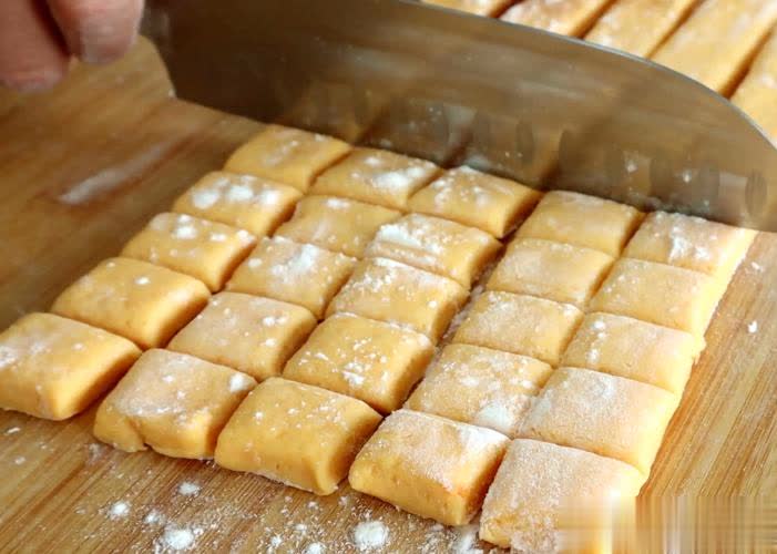 第四步:而后我们把醒发好的面团适当揉捏排气,搓成圆团之后,用擀面杖擀压成五毫米厚度的薄饼;之后我们按照下面这张图的操作,用刀切出1.5厘米长宽的小剂子。