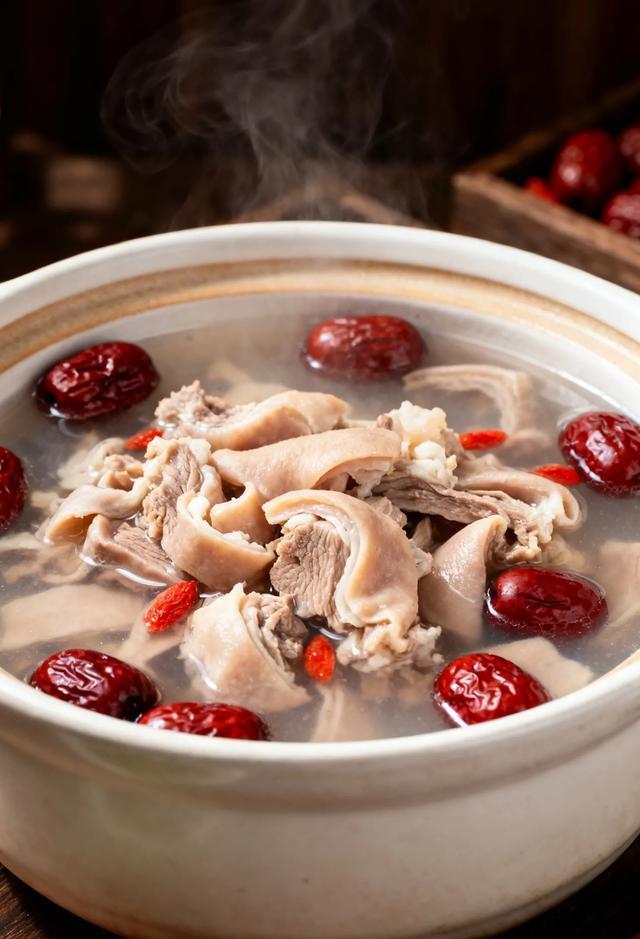 炖的时候,把洗干净的猪肚切小块,和5颗去核红枣、几片生姜一起丢进砂锅,加足量清水,大火烧开后转小火炖1个半小时。炖好的猪肚软软糯糯,汤里带着红枣的甜,我妈每次喝一碗,都说“浑身暖洋洋的”。现在她每周喝两次,连之前的“起床没精神”都缓解了——比喝红糖水管用多了,还不腻!