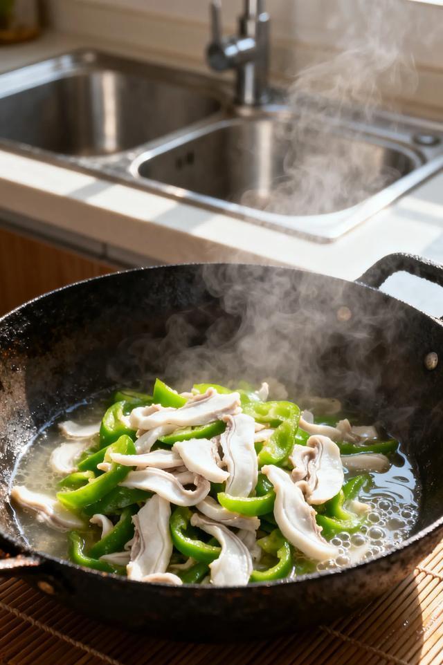 这里要注意:猪肚别炖太烂,煮到用筷子能戳透就捞出来,放凉后切薄片,这样炒的时候更有嚼劲。先把青椒爆香,再放猪肚片,加一勺生抽、少许蚝油,大火快炒1分钟就行。嚼起来脆嫩入味,我家每次做这菜,盘子都能舔干净~