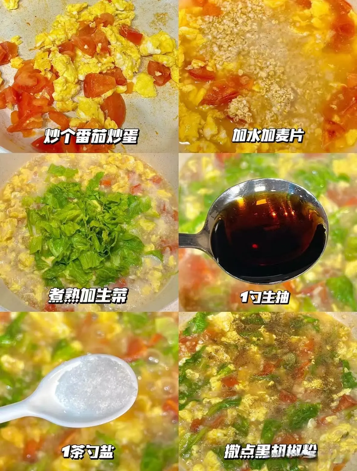 番茄含维生素 C 与番茄红素,鸡蛋提供优质蛋白,燕麦添膳食纤维,助消化、补能量,适合早餐增强饱腹感。