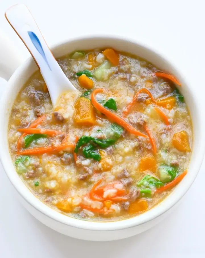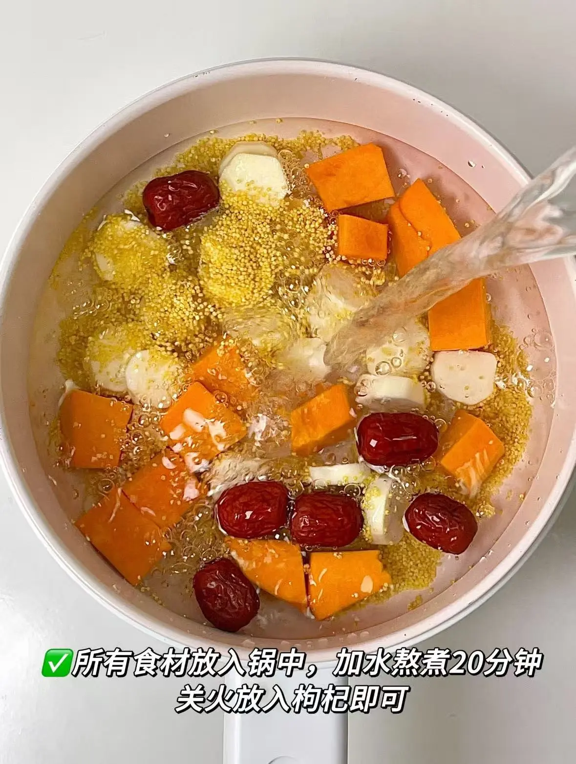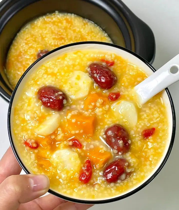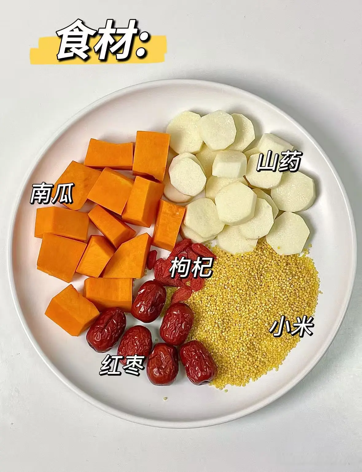 南瓜与山药健脾养胃,小米含 B 族维生素,粥品温和滋补,能调节肠胃功能,适合日常养生。