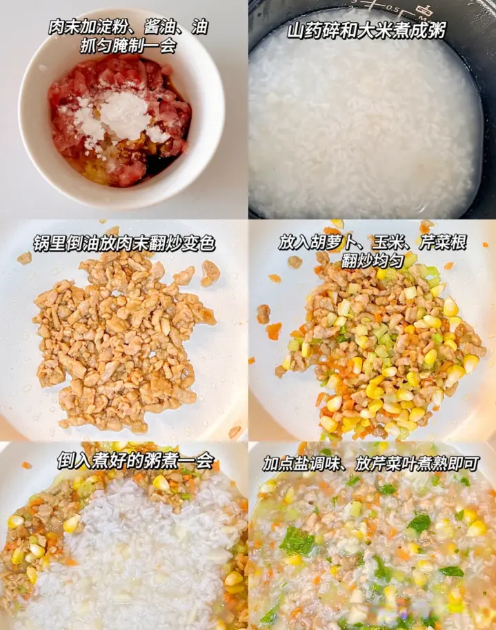 山药含黏液蛋白护脾胃,肉沫提供蛋白质,粥品软烂易吸收,能补充体力,适合消化功能较弱人群。