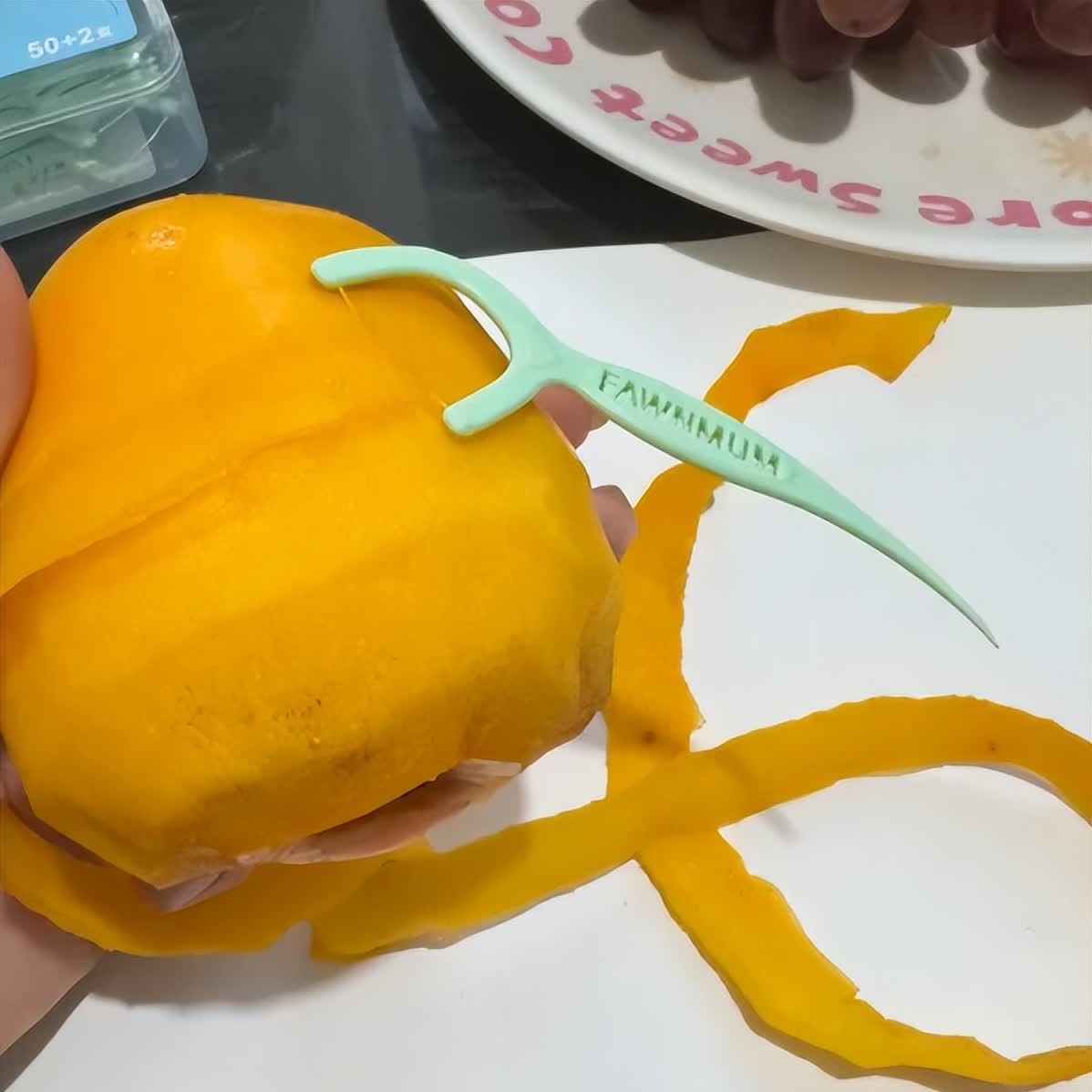 吃芒果的时候,不想脏手,也可以用牙线去皮,用牙线去皮非常方便,简单刮几下,整颗芒果就处理好了。
