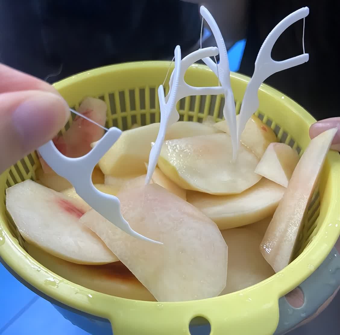 水果切块之后,牙线尖头部分,刚好可以把水果插起来,吃起来多方便。