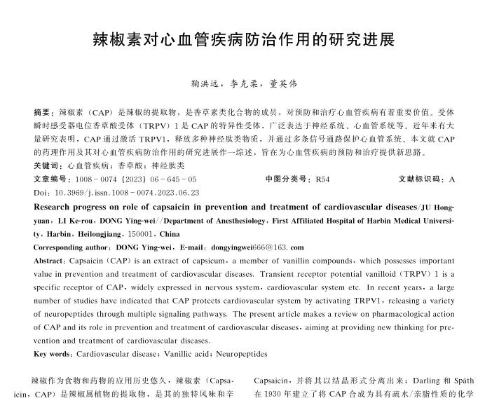 [1]鞠洪远,李克柔,董英伟.辣椒素对心血管疾病防治作用的研究进展[J].心血管康复医学杂志,2023,32(06):645-649.