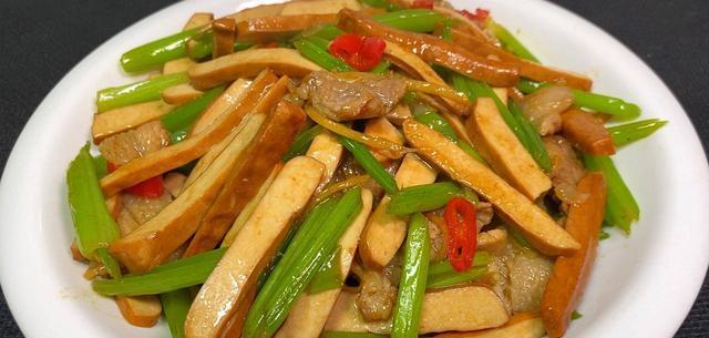 芹菜去叶洗净切段,香干切成条。烧一锅水,放少许盐,下芹菜段焯水1分钟捞出。热锅倒油,放蒜末爆香,下香干条翻炒1分钟,加生抽调味,再倒入芹菜段一起炒30秒,加盐拌匀即可。