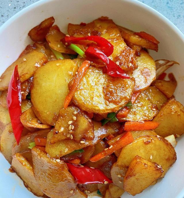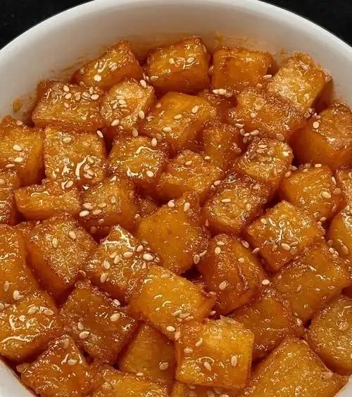 3、锅留底油,倒入调好的料汁,小火煮至料汁浓稠,放入炸好的土豆丁,撒上芝麻,翻炒均匀即可出锅。