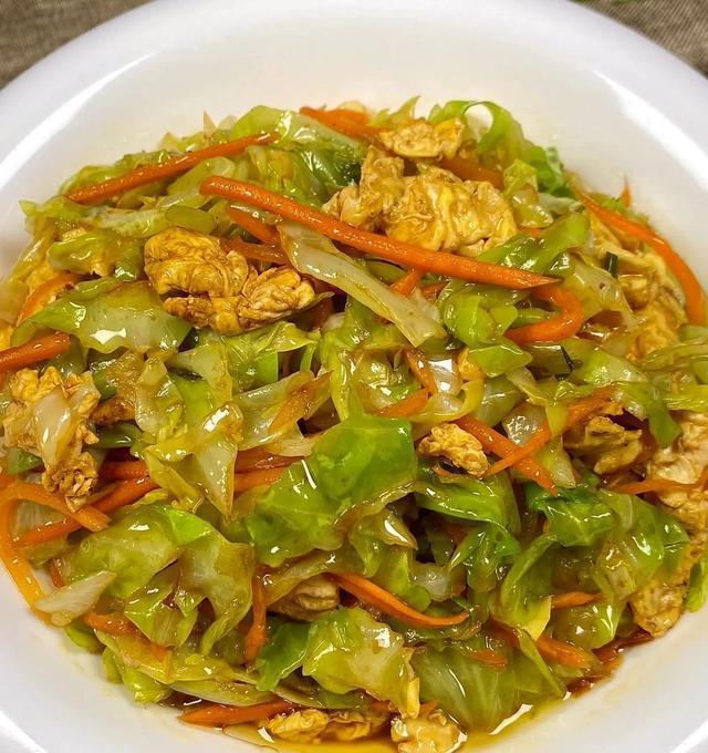 1.鸡蛋打散炒熟盛出,包菜、青椒切丝,2.热油爆香蒜末,下包菜丝炒至变软,3.加入青椒丝,倒入炒好的鸡蛋,4.先淋入生抽,接着再淋入蚝油,之后稍加少许盐用以调味,随后以大火将其快速炒匀。