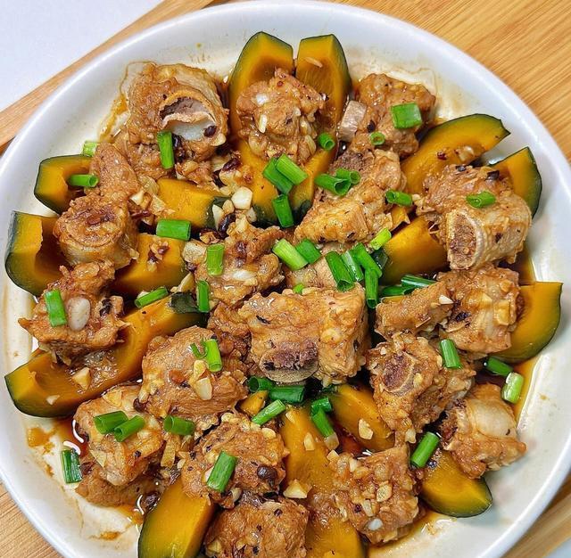 材料:南瓜 500 克、排骨 300 克、大蒜、生姜、豆豉、料酒、生抽、淀粉、盐、食用油适量。