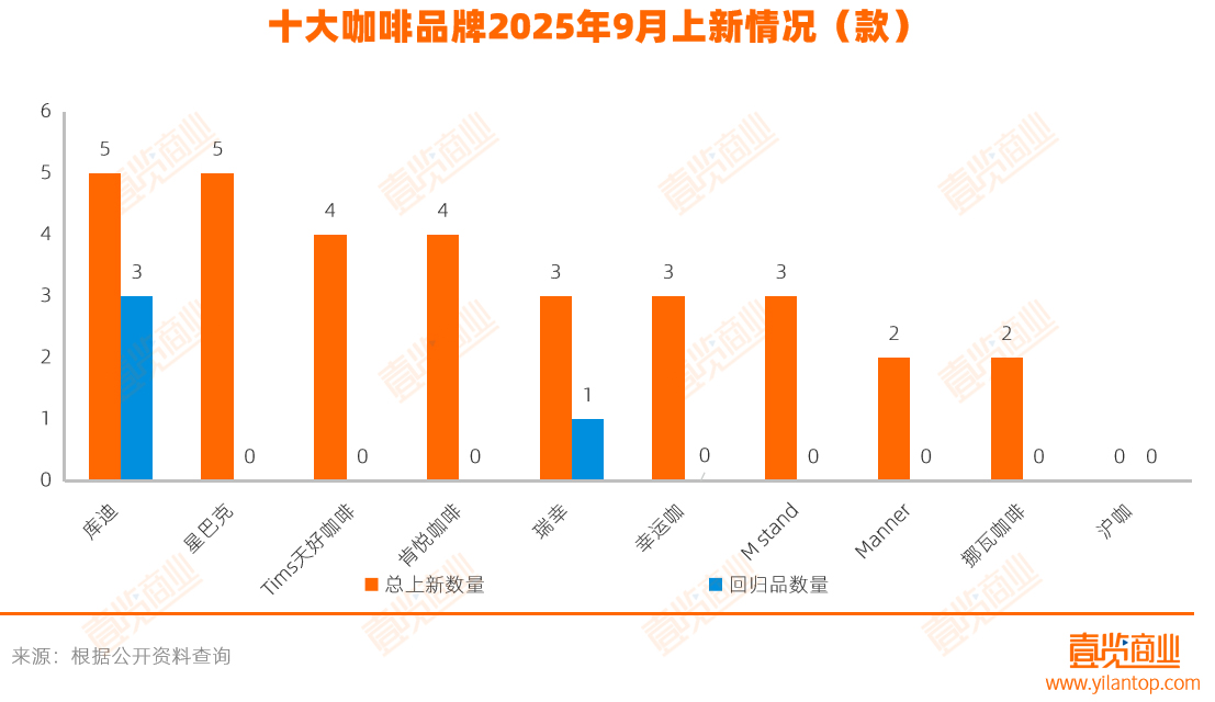 咖啡品牌中,库迪和星巴克上新最为活跃,各有5款新品上市;Tims天好咖啡与肯悦咖啡并列其后,分别推出4款新品。其他咖啡品牌在9月也保持了稳定的推新频率,上市2至3款不等。