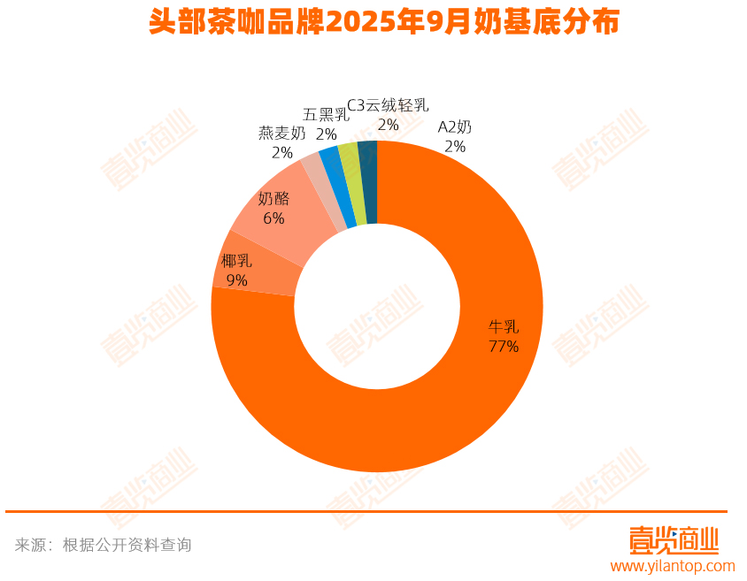 从奶基底看,牛乳仍然是经典且普遍的选择,共计使用了40次,占比77.0%;其次为椰乳,占比9%。此外,在本轮上新中,酸奶基底并未被使用,或许反映出品牌在秋冬产品线上更倾向于浓郁、醇厚而非清爽的质地。