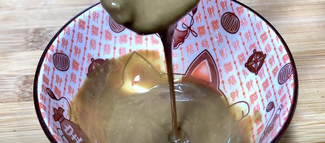 2、接下来准备两勺芝麻酱,放入碗中,往里面淋上适量的香油,用勺子给它搅拌一下,把芝麻酱稀释开,搅拌好之后,放一旁备用。