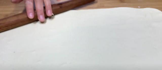 4、这时候,面团也醒发好了,将它放在撒上面粉的案板上,用手揉搓排气,揉成原来的大小,再往上撒一点干面粉,用手案板,然后给它擀成一个长方形的大面片,厚度大约在0.2厘米左右。