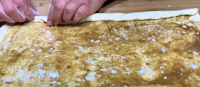 5、紧接着,在面片上淋入调好的芝麻酱,不喜欢吃芝麻酱,也可以淋上油酥,用刮板涂抹均匀之后,再撒上一点干面粉,然后从一端卷起来,尽量卷得紧实一些,这样层次会更加的丰富,收口处放在底部,给它稍微整理一下,再切成大小相等的面剂子。