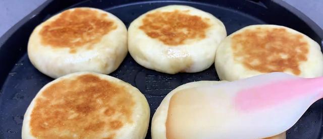 8、时间一到,打开盖子,依次将小饼翻个面,继续盖上盖子,烙3分钟,直到小饼变得鼓鼓的,用铲子按压一下,就能立马回弹,就证明饼熟透了,把它取出来,装入盘中备用。