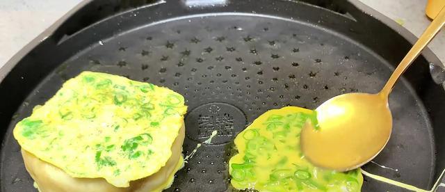 10、紧接着,再舀上2勺蛋液,用勺子摊开,放上小饼,然后在旁边也舀上2勺鸡蛋液,用勺子摊开,把小饼扣上来,按照这个方法,把所有的小饼都给裹上葱花鸡蛋液,用中火给它烙至两面金黄,出锅装入盘中,美味即成。