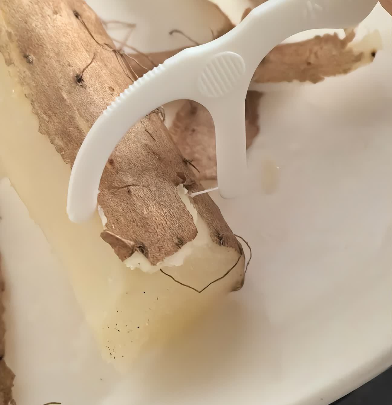 除了猕猴桃之外,像是我们平时吃的山药,山药皮很容易把手弄得痒痒的,直接用牙线也可以把山药皮去掉。