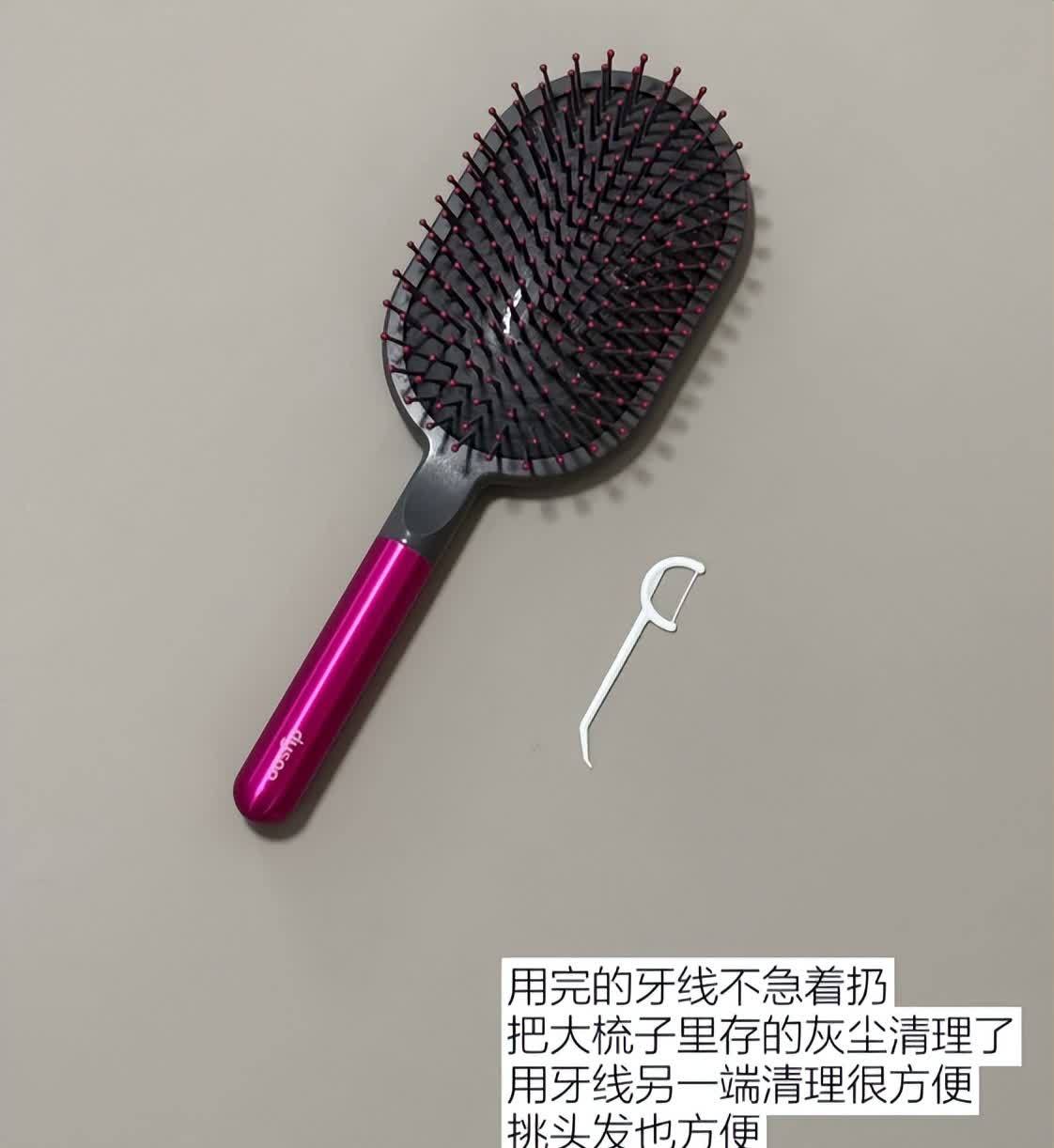 清洁方式非常简单,用牙线尖头部分,先把气垫梳缝隙抠一抠,然后欧再用另一端清洁,不管是灰尘也好,还是毛发,都能去掉。