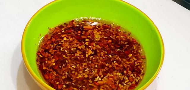 5.接着我们再来调个凉拌汁:先将蒜末放入小碗内,再分别 加入白芝麻和辣椒面各一勺,然后将烧开的热油倒入激发出它们的香味后,再加入适量的白糖、陈醋、生抽、香油和一勺蚝油,完全搅拌均匀即可。