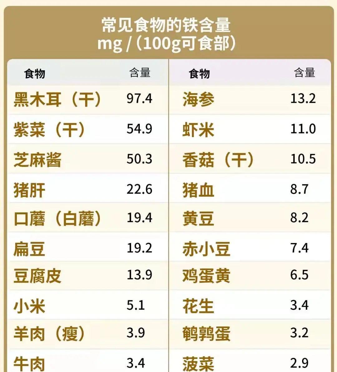 2、非血红素铁存在于植物性食物、铁强化食品和补充剂中,吸收率大多在10%以下。含铁丰富的有:动物血和动物肝,每周吃1~2次,比如猪血、鸭血、猪肝等;瘦的红肉(孕中、晚期每天多吃20~50g,也就是半个掌心到一个掌心大小、厚度等同手掌厚度的量(这里指的是生肉的量)。