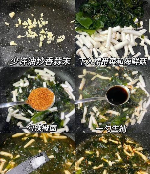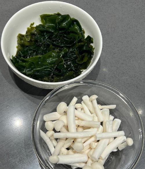 1. 干裙带菜1小把(约5克),用温水泡5分钟(别用开水,免得泡烂),泡软后挤掉水分,剪去硬根;白玉菇1把(约150克),剪去根部老蒂,掰开洗净沥干;