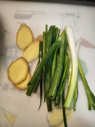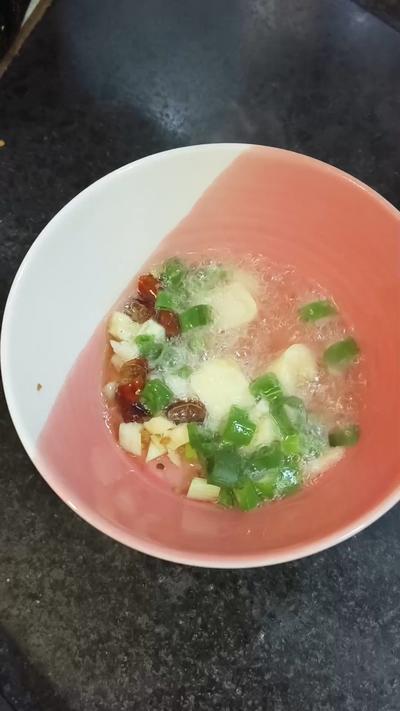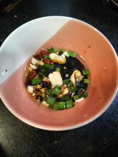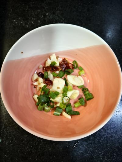 7. 准备调蘸料汁,蒜,葱,干辣椒都切小块,放在小碗里。