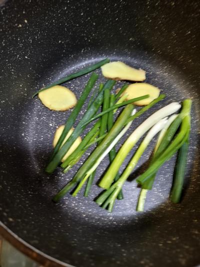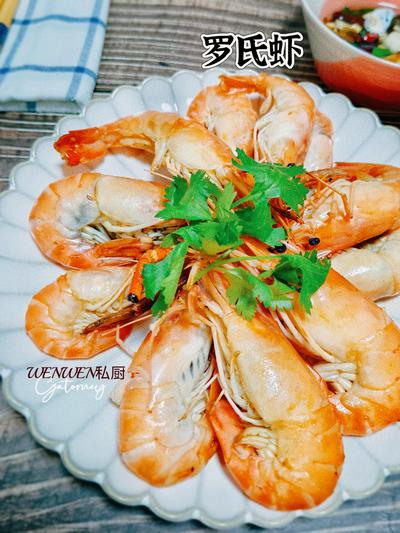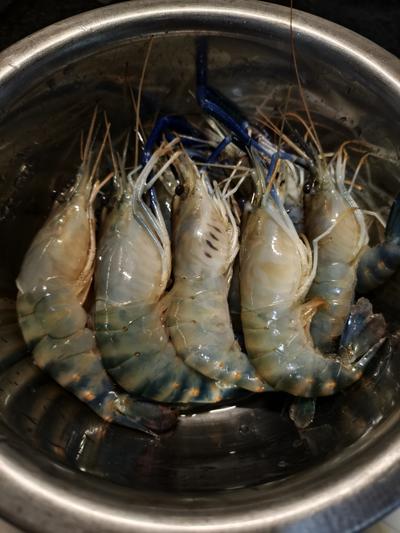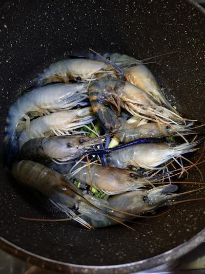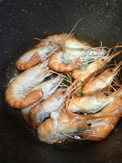 4. 虾放上去,淋少许食用油,料酒,盖上盖子,中火煮到收汁,虾变色,如果太干可以放少许清水。