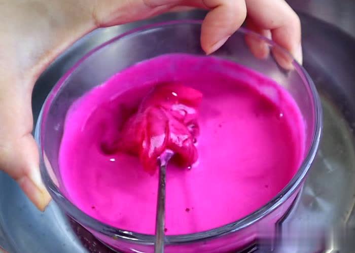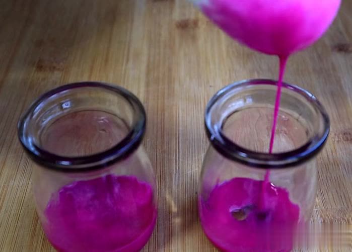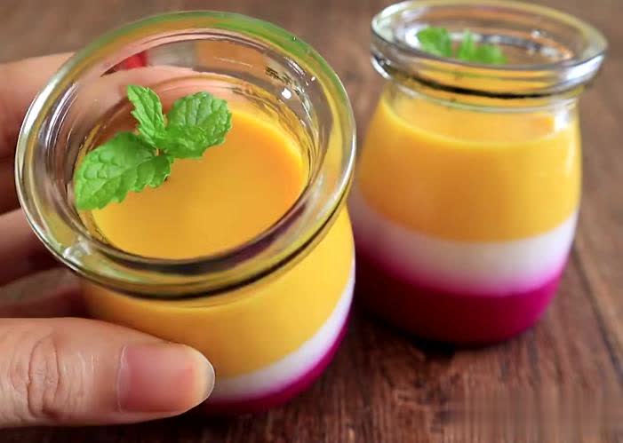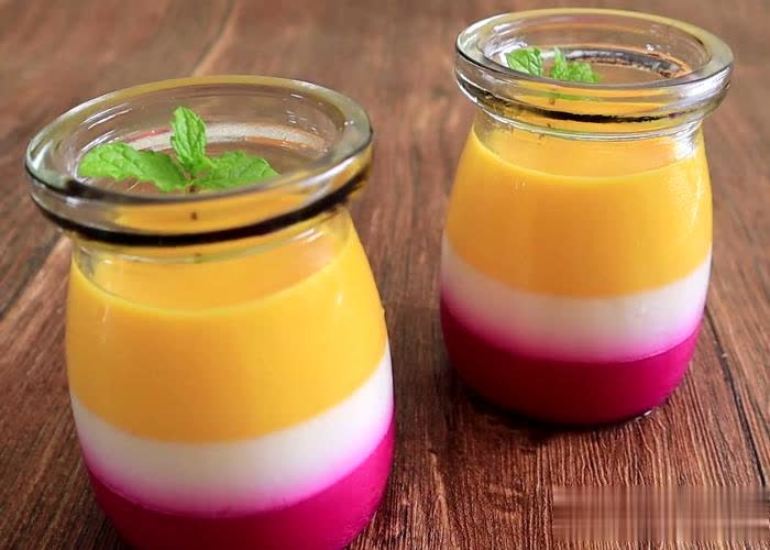 第四步:之后按照下面这张图的操作,先把火龙果汁覆盖整个容器1/3的体积,静置凝固之后,把纯牛奶也注入容器1/4的体积,再次凝固之后,把芒果汁倒入其中,等待凝固即可食用。对于这步来说,等待期间为了防止另外两种食材因为冷却的缘故造成液体凝固,一定要把它们放入热水中,保持一定热度哦。