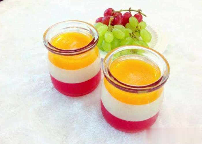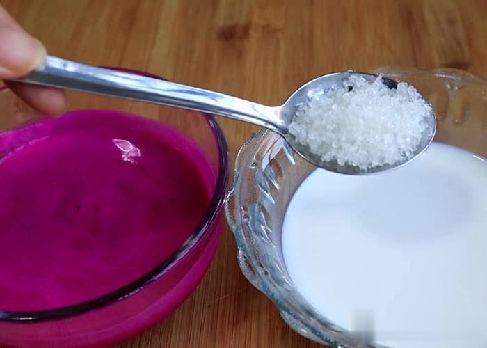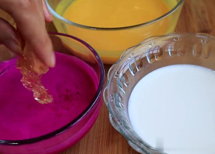 第一步:首先用剪刀把吉利丁片剪碎,放在清水中适当泡软;把两种水果分别去皮去核,切成小块之后,分别放入榨汁机中,加45毫升的凉白开,打制成果汁;随后把果汁通过滤网装入2个碗中备用;之后我们把白砂糖等分三份,加入装有纯牛奶、火龙果汁、芒果汁的三个碗中,均匀搅拌30秒备用。
