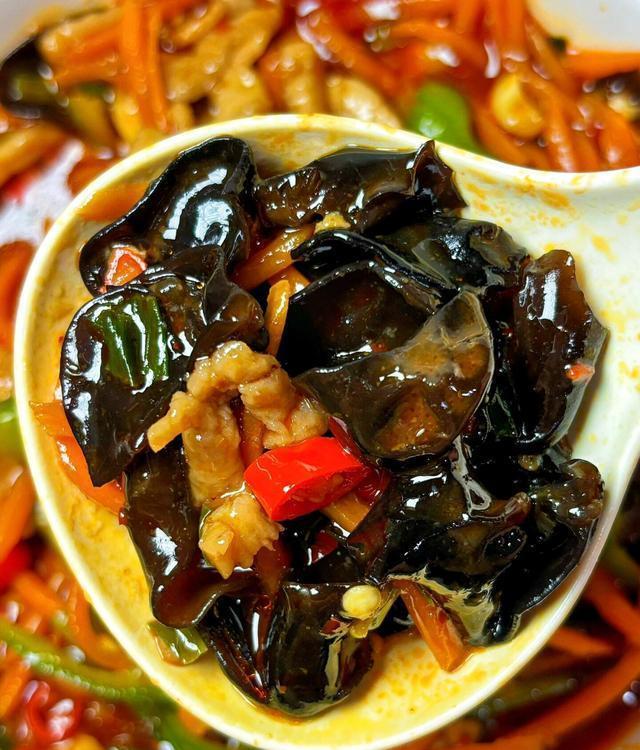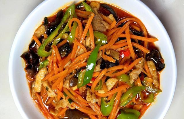 加入蔬菜:将木耳丝、胡萝卜丝、青椒丝和大葱丝依次加入锅中,快速翻炒至断生。