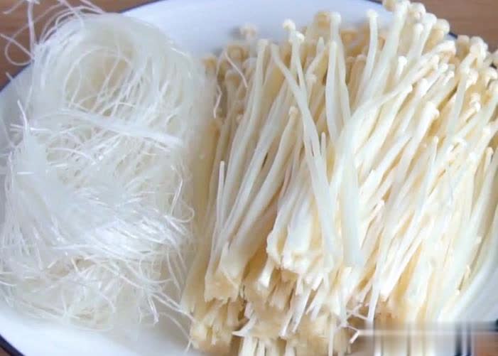第二步:随后把粉丝放在一碗30度的温水中浸泡十分钟,泡软之后捞出;金针菇切去根部之后撕成小束备用;尖椒切成小段。