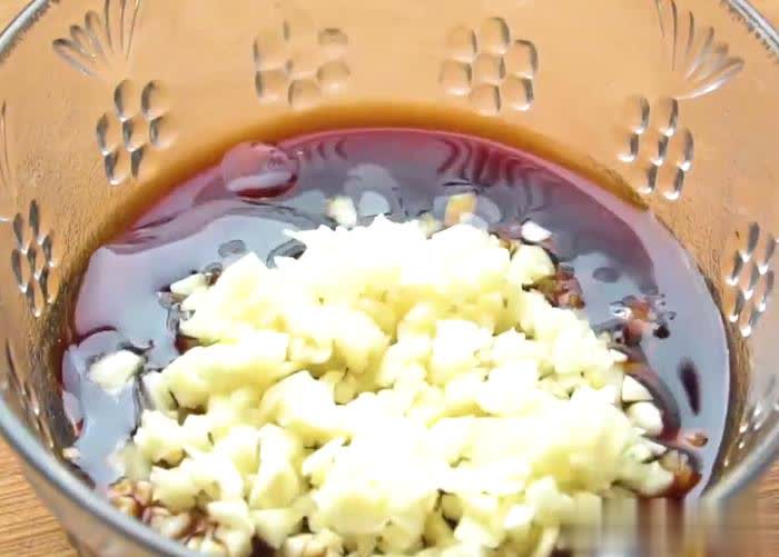 第三步:准备一个小碗,加入三勺蒸鱼豉油,蒜末,一勺蚝油,半勺生抽,一勺料酒,均匀搅拌备用。