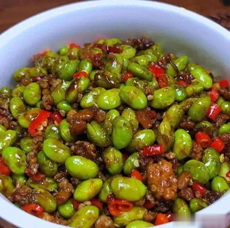 4、另热锅烧油,油热以后,放入蒜末爆香,接着倒入青红椒和毛豆一起翻炒均匀,然后加入适量的食盐、蚝油和白糖调味提鲜。