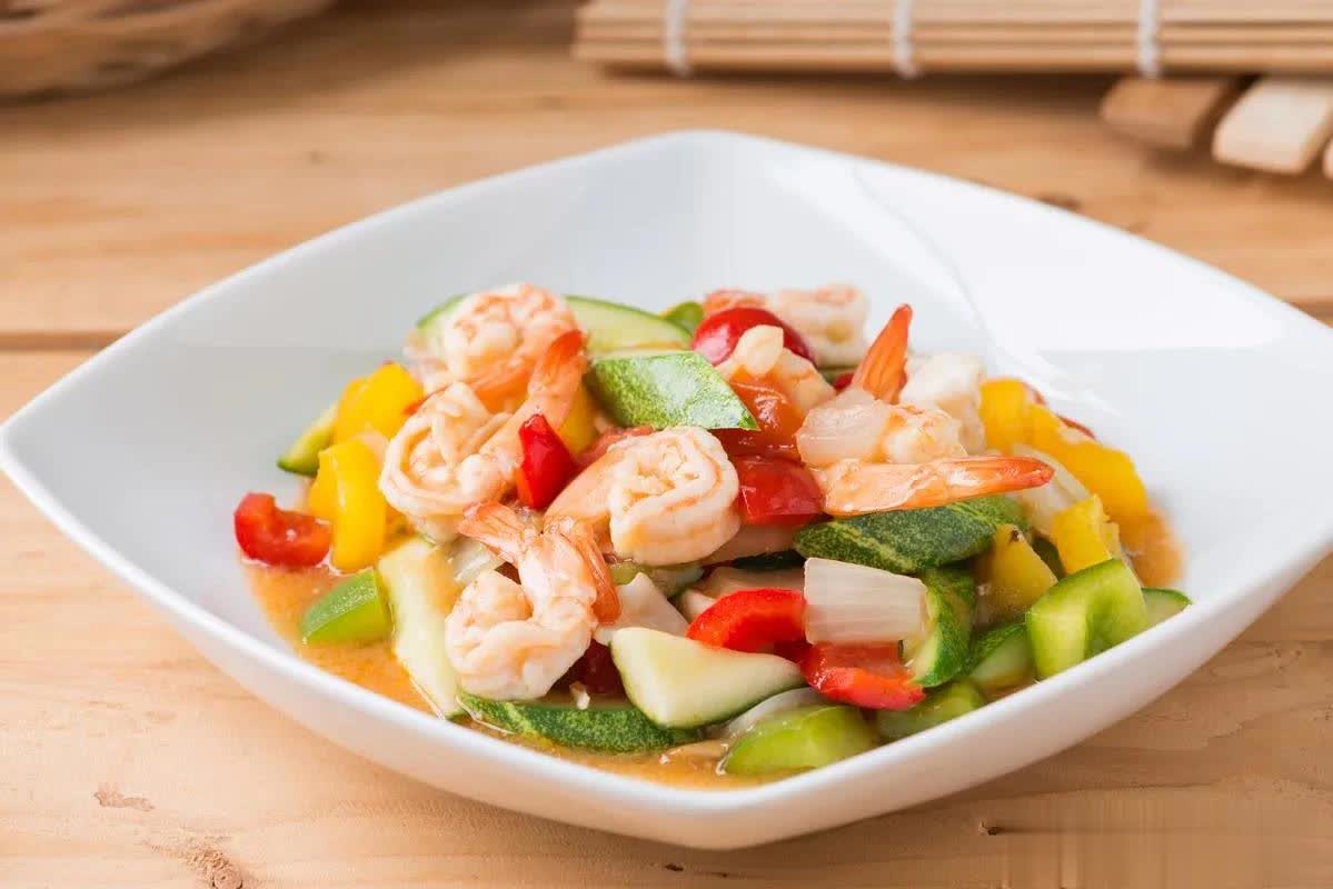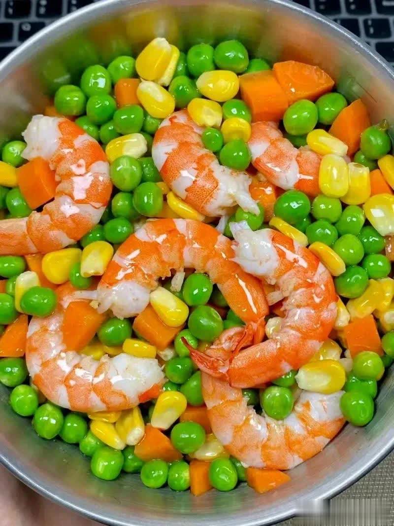 4. 热锅加油,放入蒜末炒香,接着加入虾仁翻炒至变色,再放入豌豆与胡萝卜。随后,加一小勺盐,倒入鸡蛋,并撒上少许黑胡椒粉翻炒均匀,即可完成。