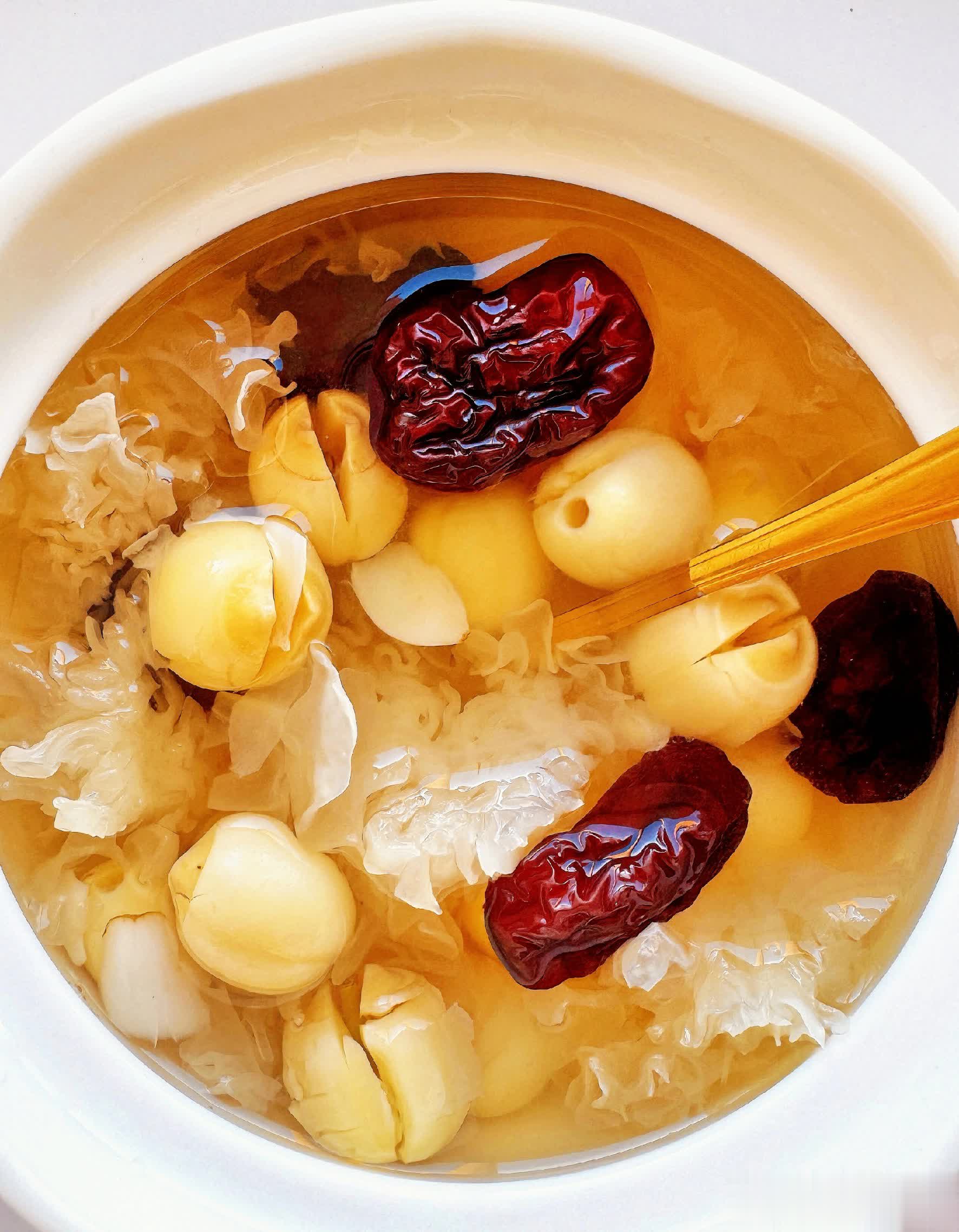 最后加入适量的冰糖调味,搅拌均匀,待冰糖融化后即可出锅。银耳莲子羹口感滑润,香甜可口,具有润肺养颜、安神助眠的功效,是中秋时节女性朋友的养生佳品。
