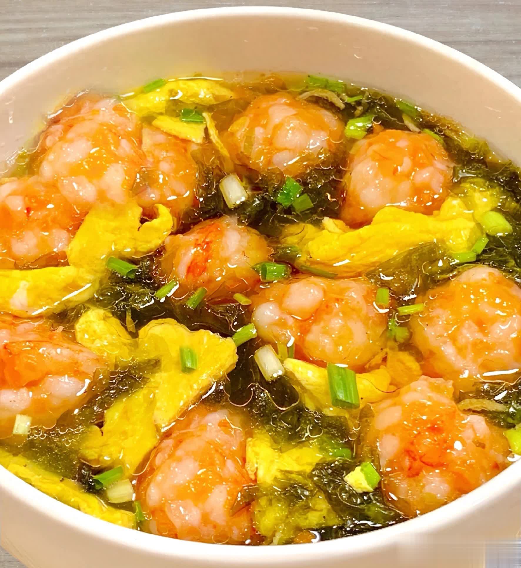 食材准备: 虾滑150克(市场有售),紫菜一片,鸡蛋2个,姜丝、葱花、盐、白胡椒粉适量。