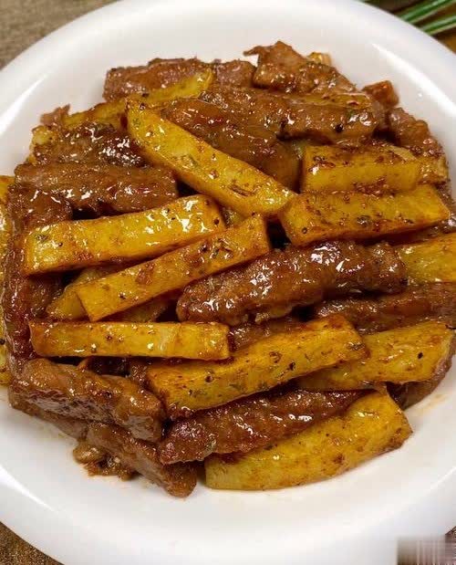 3.锅留底油,倒入土豆丝、胡萝卜丝炒至断生,加少许盐炒软;倒入牛肉,加半勺蚝油