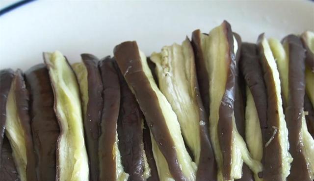 4.现在咱们的茄子也蒸好了,先把它们取出来放凉,然后下手撕成长条,个人建议不要撕的特别细,吃的时候也更方便,均匀的码在盘子里。