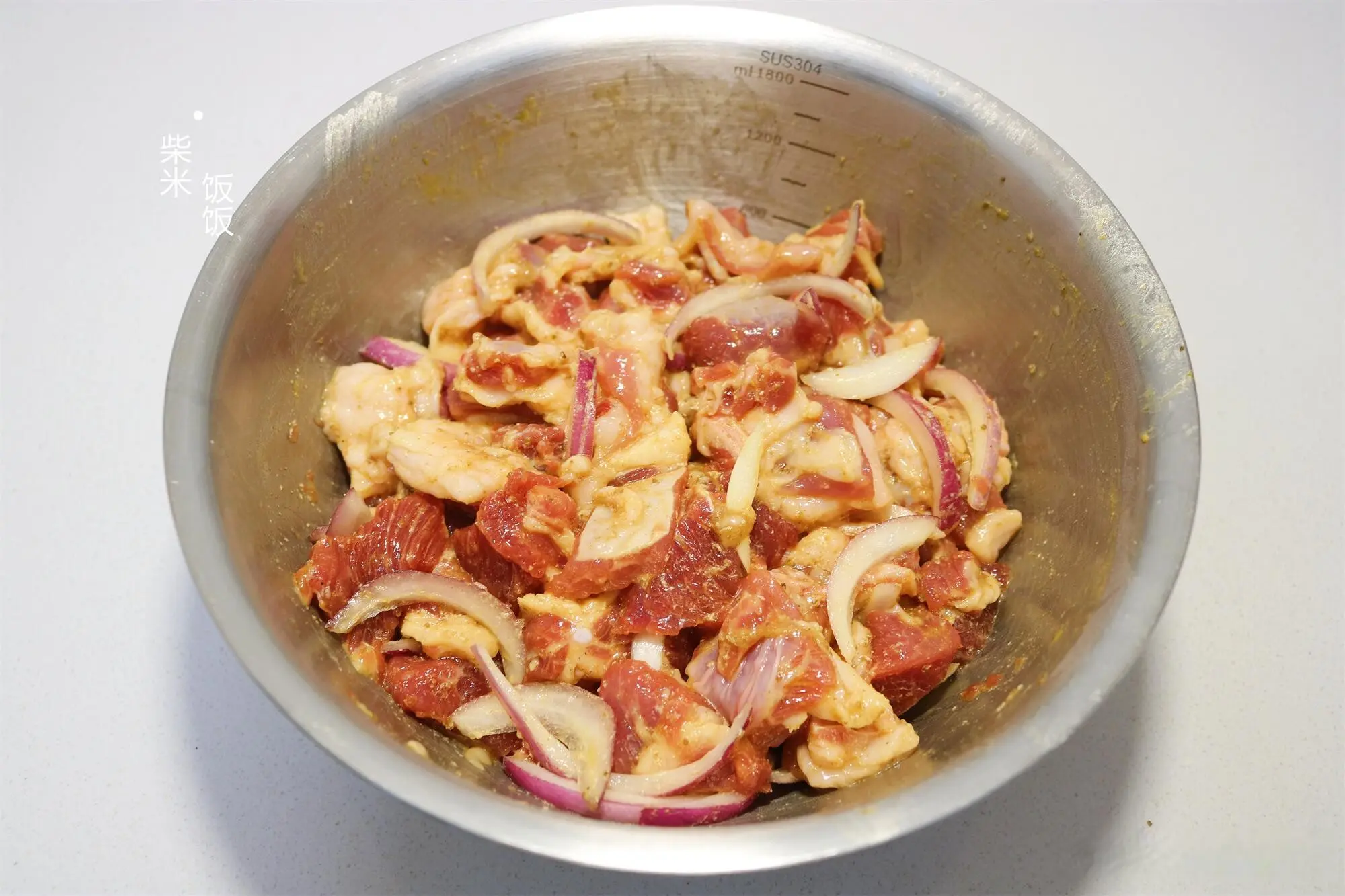 5,放点洋葱丝,抓匀腌制10~20分钟。羊肉腌好,放点白芝麻拌匀。