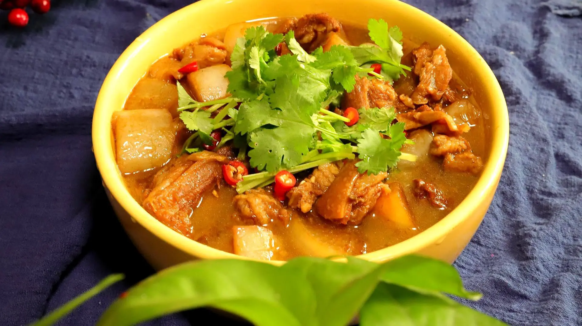 4、往里边添上热水,炖一个小时左右。切点大块的萝卜倒里边,补点盐到汤汁中,翻炒匀后再焖四十分钟,软烂入味后关火。