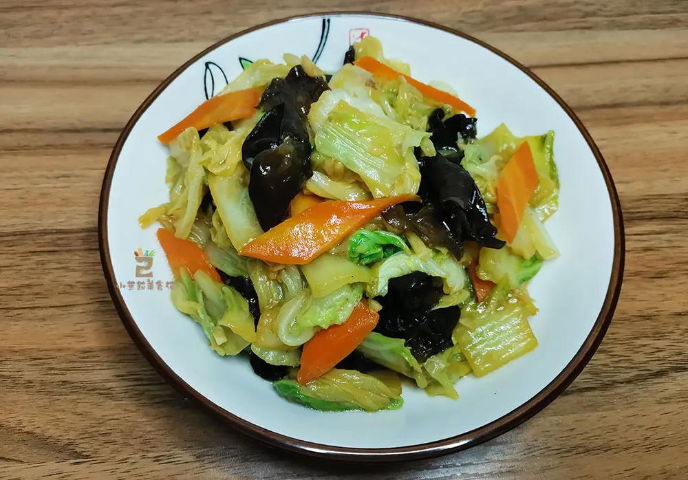 4、起锅放油,葱蒜都加到里边,胡萝卜倒进去,多炒一会儿,接着放白菜和木耳,加酱油,蚝油,盐,炒一会儿,调味料均匀混合。最后淋一些芡汁,这样食材会更入味。汤汁收浓稠后装盘。