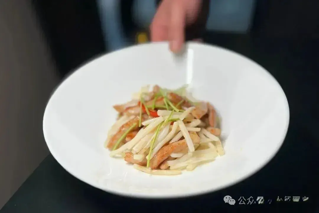 4.京葱切丝用冰水浸泡5分钟后捞起沥干水分,拌料搅拌均匀再放入京葱丝中拌匀;