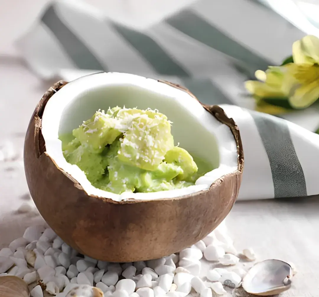 辅料: 椰子1只 青线椒170克 蒜头30克 姜片20克 葱绿30克 椰浆75克 杏鲍菇块100克 鲜花椒3克
